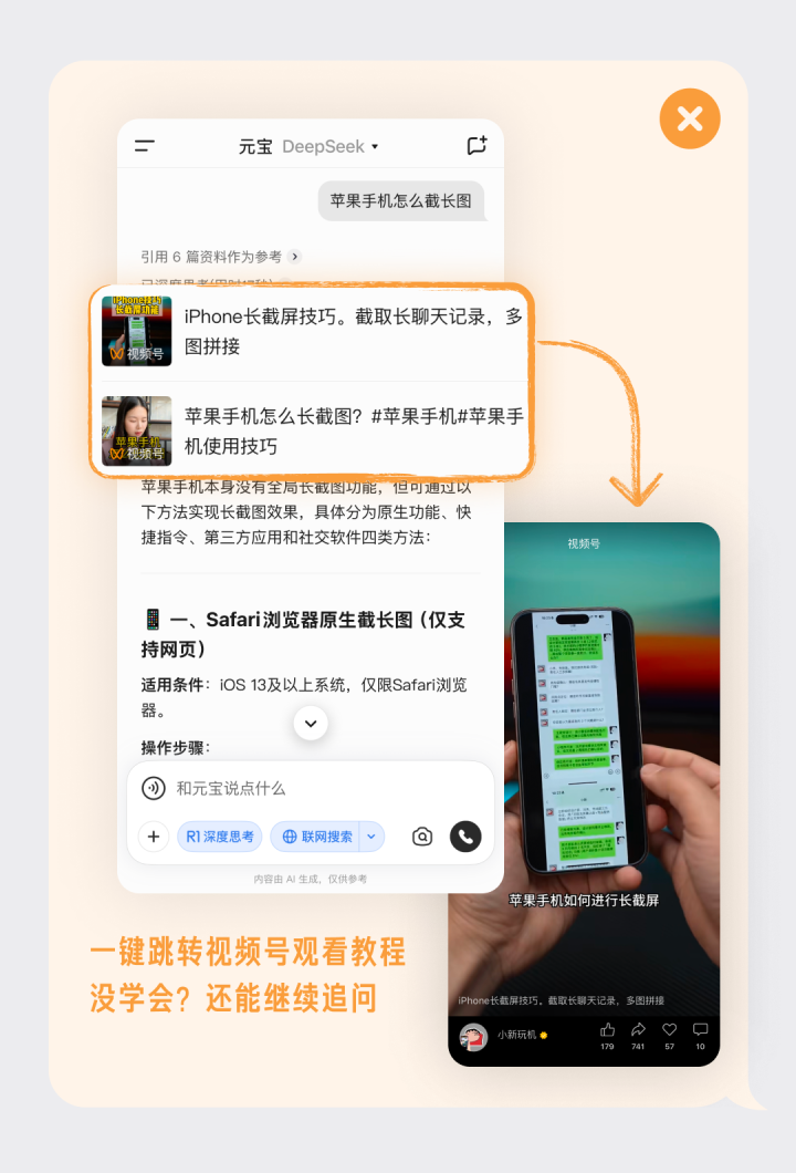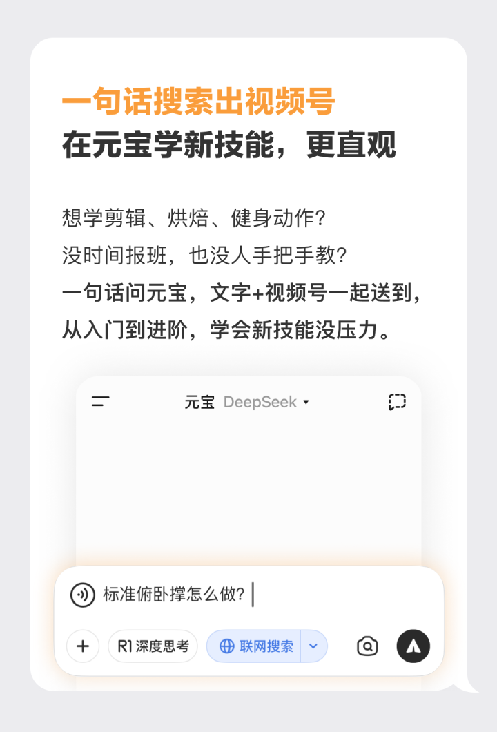 用户打开“联网搜索”,一句话提问,元宝回答即可自动匹配图片及视频号,支持任意模型,不限“深度思考”是否开启。在回答结果中,还可智能引用视频号相关教程,对用户的提问可输出文字+视频配合讲解的内容。同时,还支持一键跳转视频号观看教程,若用户“没学会”还可继续追问。